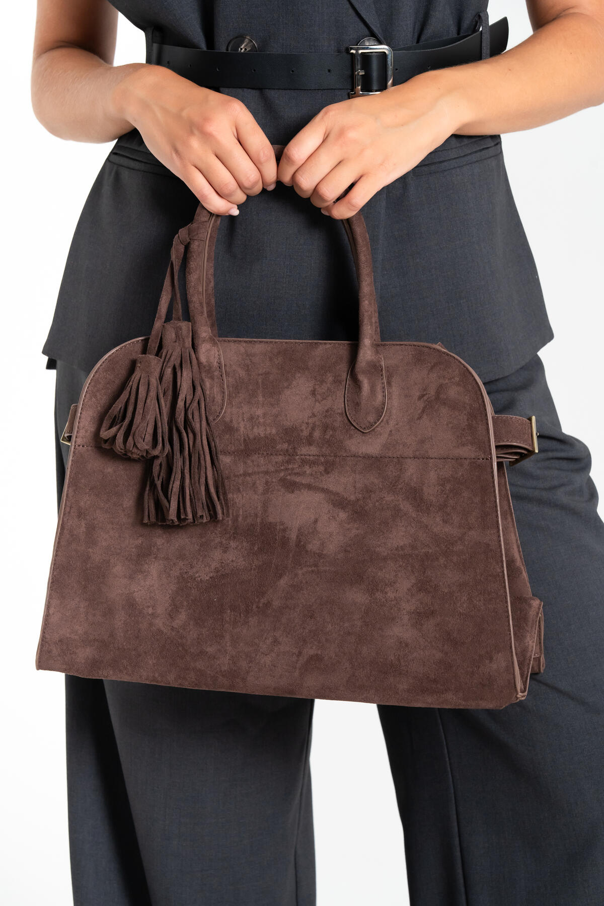 Borsa da donna in pelle scamosciata, modello bauletto di media grandezza con chiusura a zip.