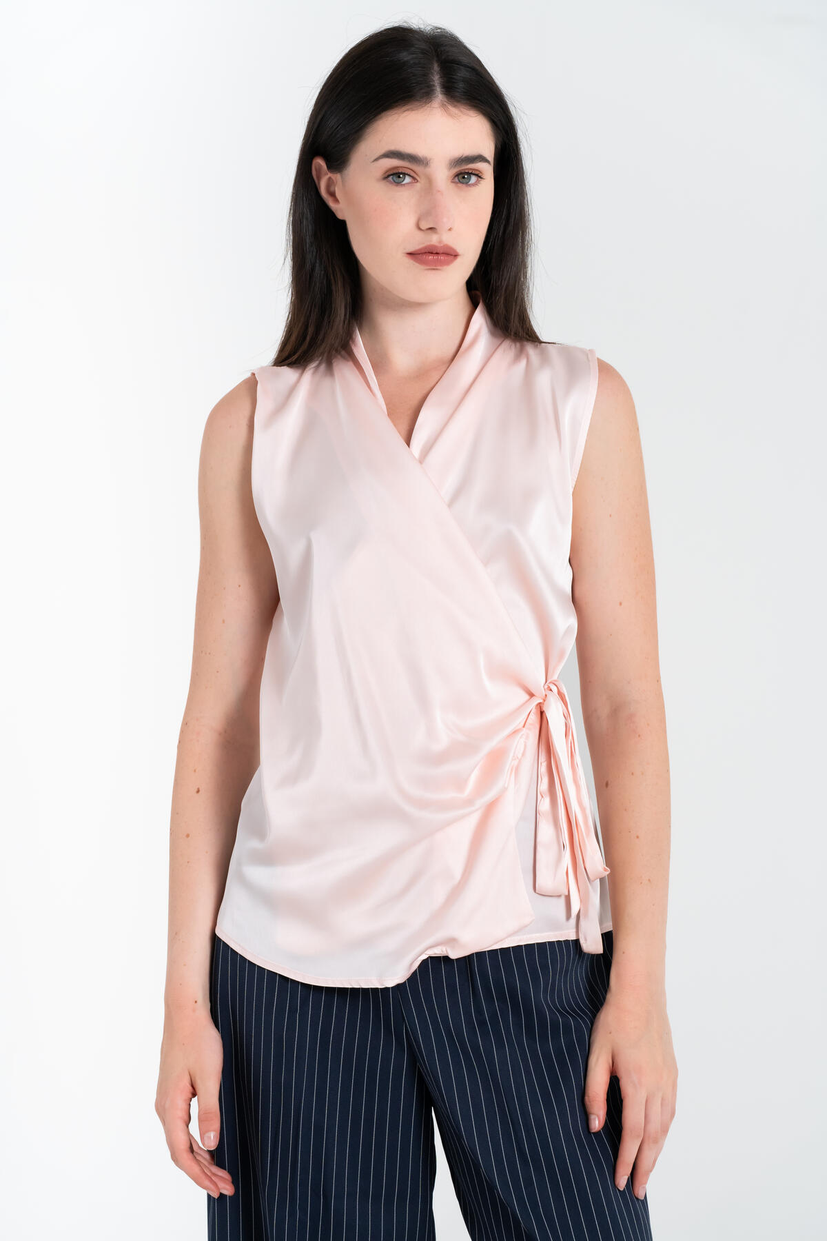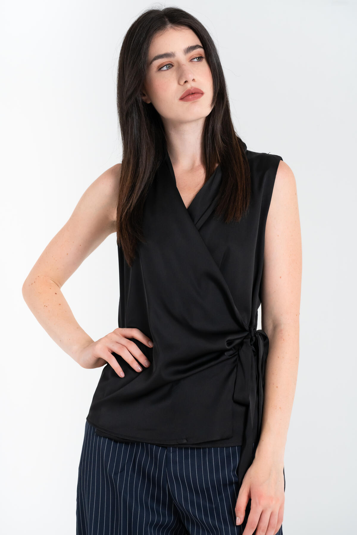 Top camicetta smanicata da donna con chiusura a kimono, laccio laterale e bottone interno. Realizzato in tessuto simil seta.