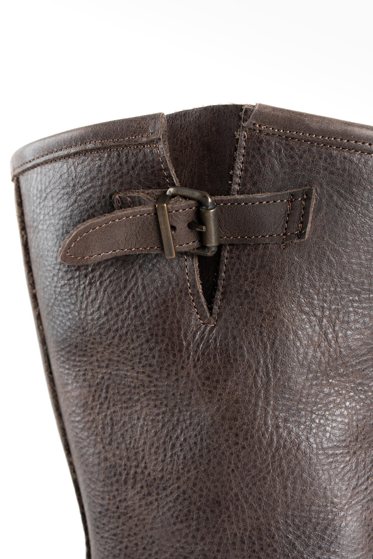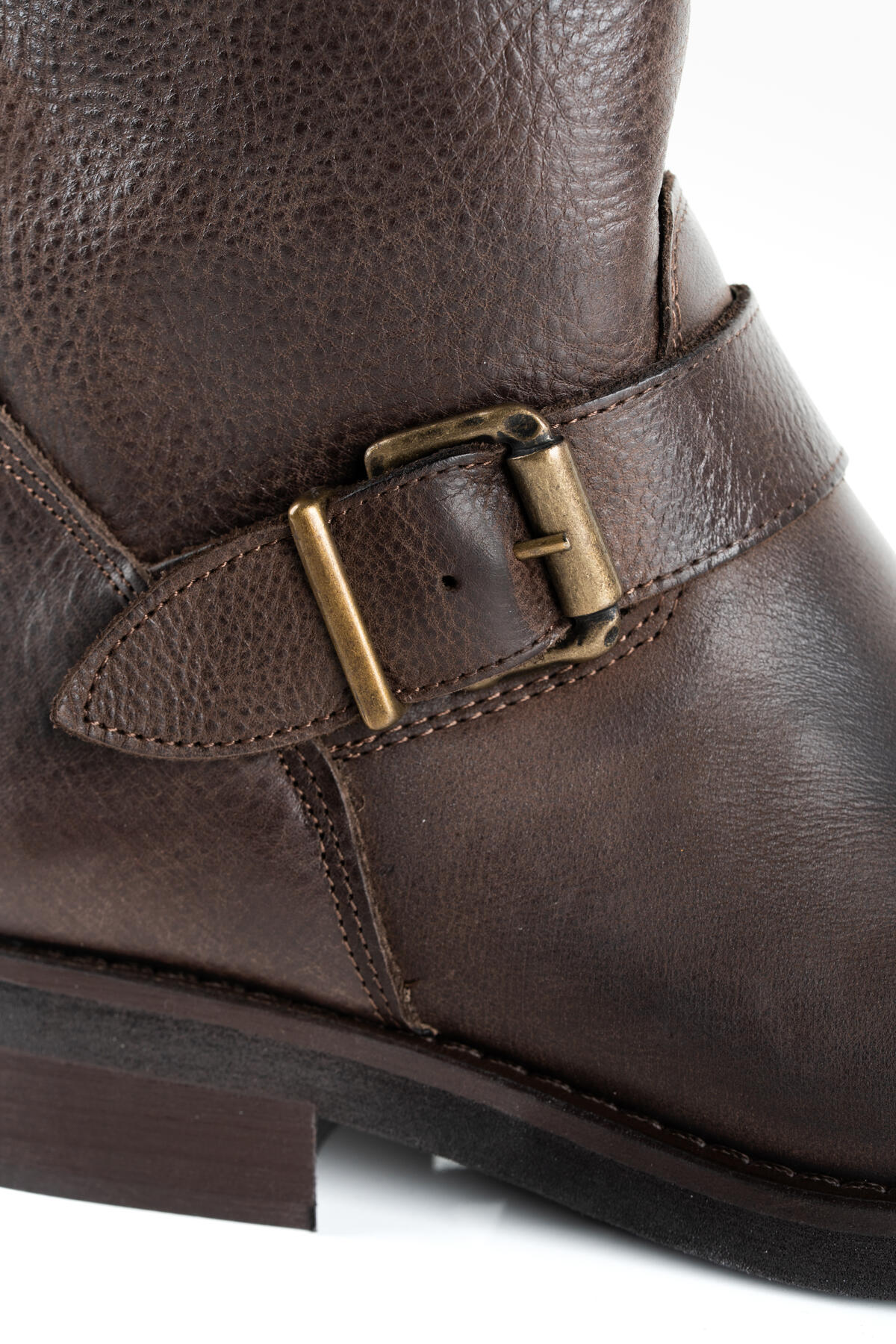 Stivale da donna in pelle color testa di moro dal design biker, con dettagli robusti e uno stile grintoso.