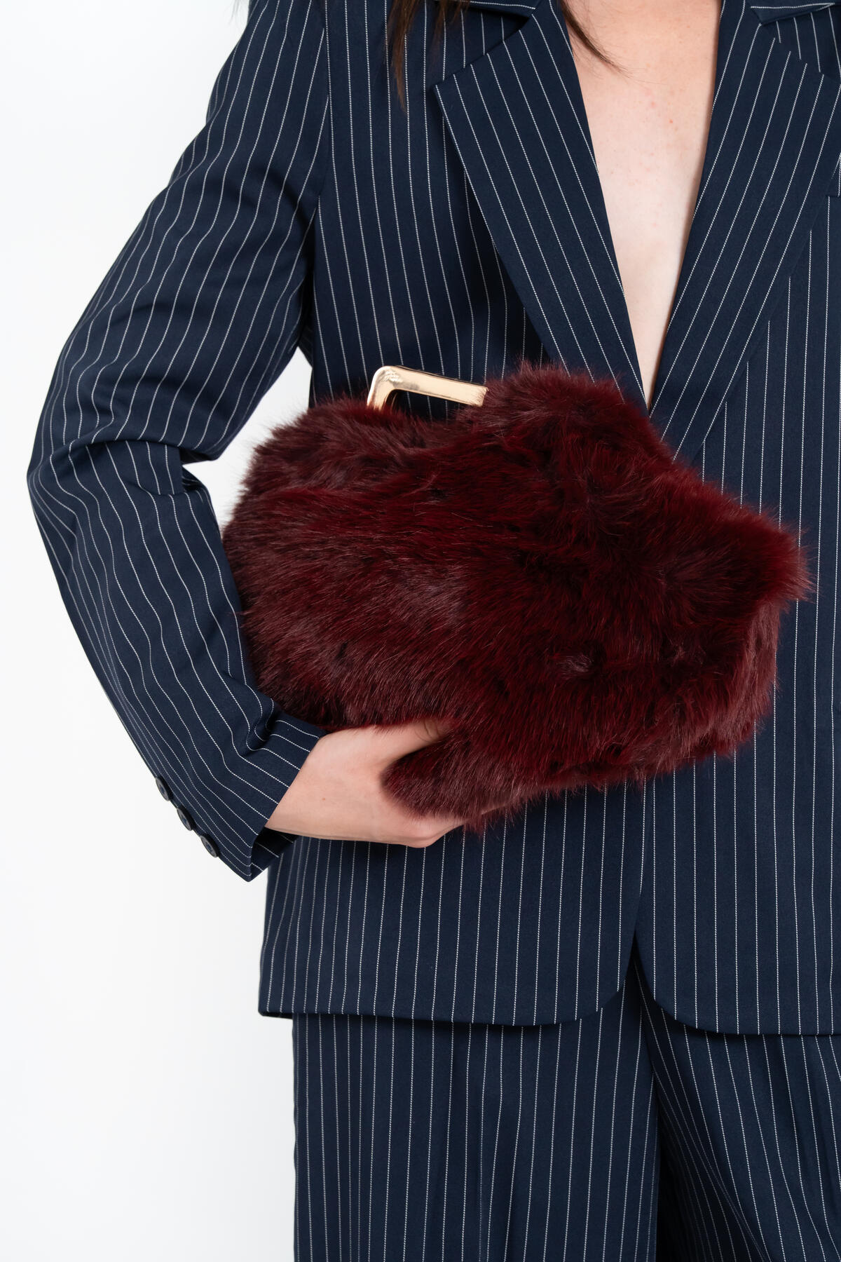 Pochette con rivestimento in pelo, dotata di manico in acciaio e tracolla opzionale in acciaio.