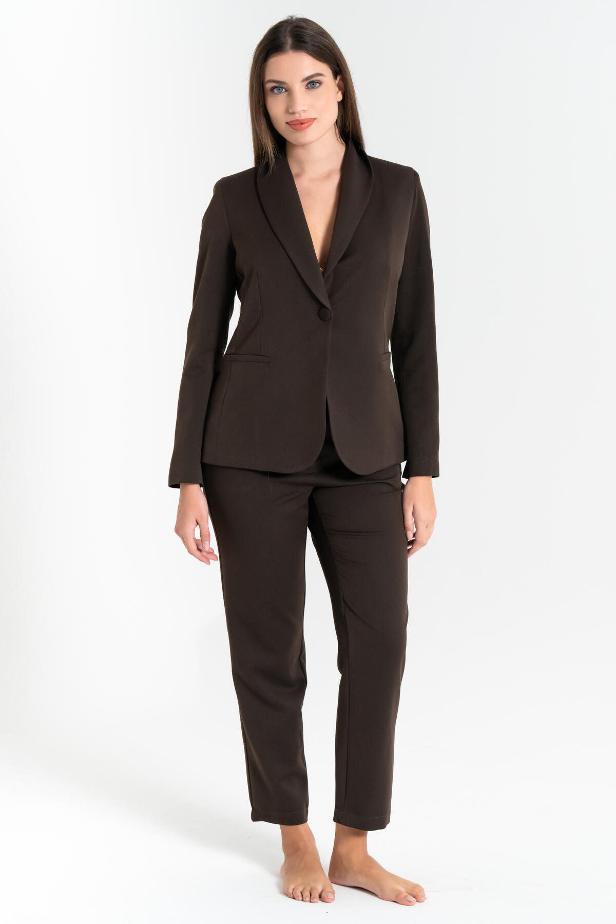 Giacca elegante da donna con colletto e chiusura frontale a un bottone.